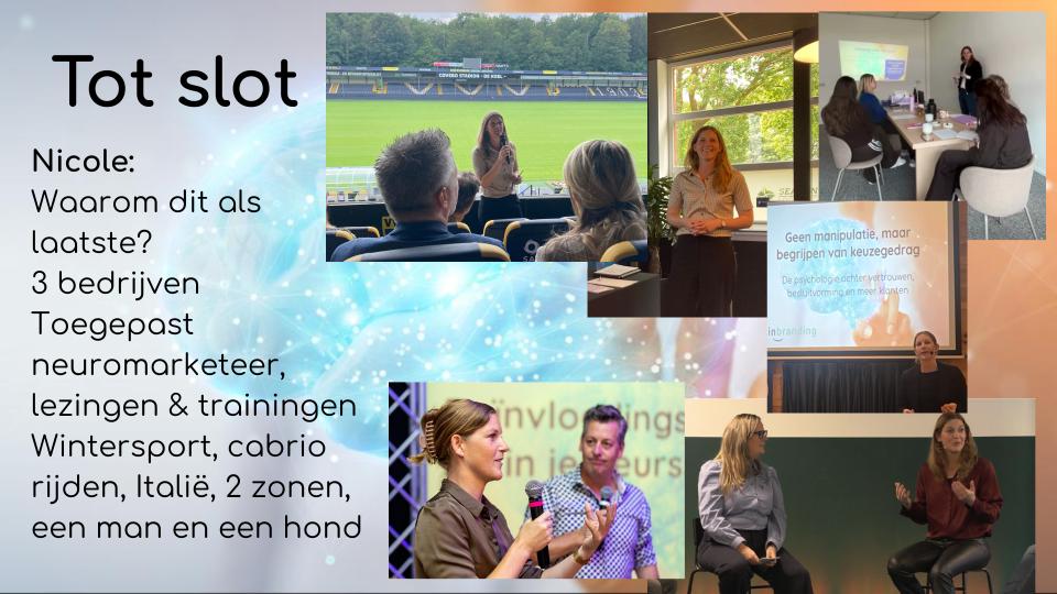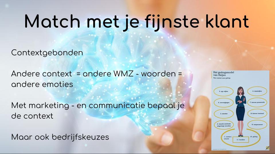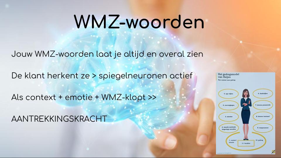 Ik leer je welke aspecten van ons brein en keuzegedrag belangrijk zijn en welke beelden, woorden en kleuren passen bij een bepaald aanbod. Ook laat ik je zien hoe ons onbewuste in de lead is en hoe je op een oprechte manier verbinding maakt.