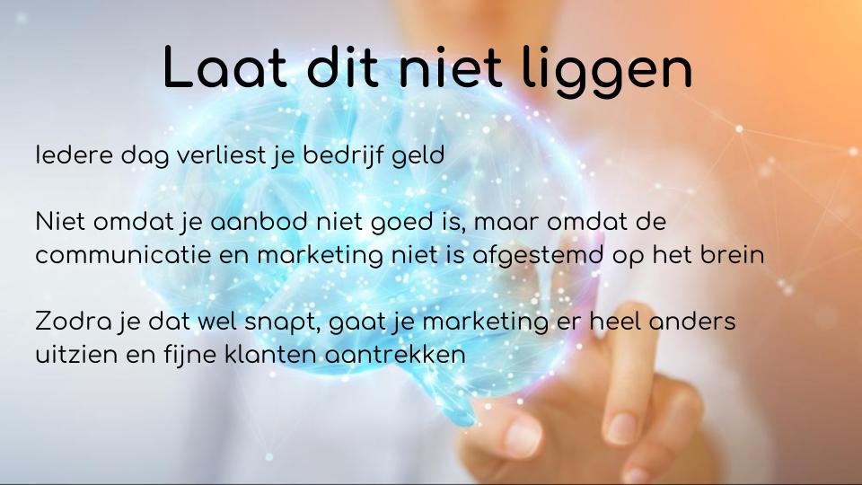 En als jij snapt hoe ons brein werkt, hoe we daadwerkelijk keuzes maken en hoe je jouw fijnste klant aantrekt (zonder manipulatie), laat je geen geld meer wegstromen.